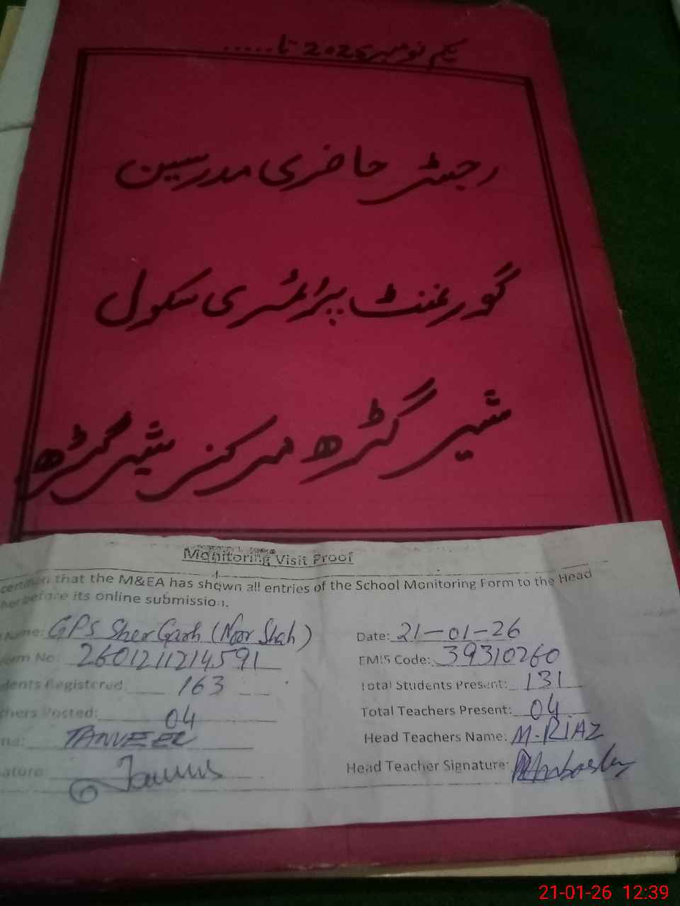 | Attendance Register | Head Teacher | MEA with School | Visit Proof |
