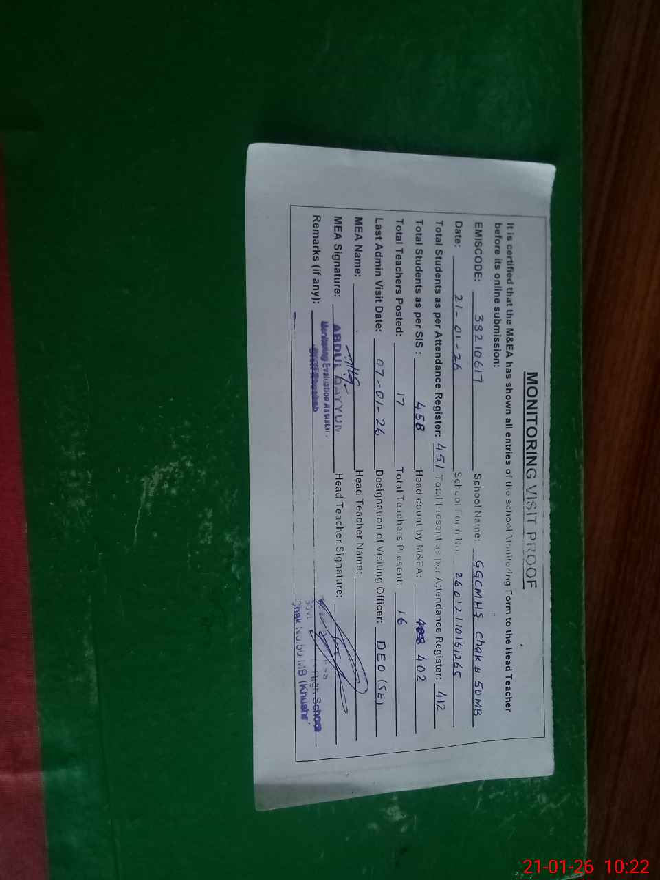 | Certified that this School was Inspected by the Undersigned MEA/DMO Today and the Information Stated Above is as Per Record. | |||||