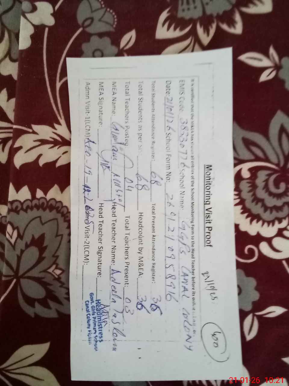 | Attendance Register | Head Teacher | MEA with School | Visit Proof |