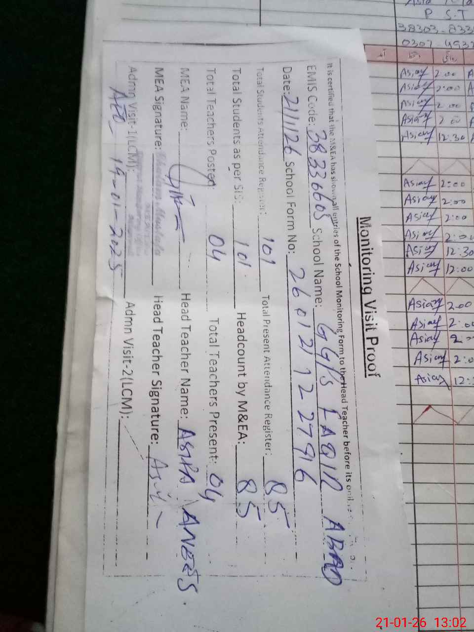 | Attendance Register | Head Teacher | MEA with School | Visit Proof |
