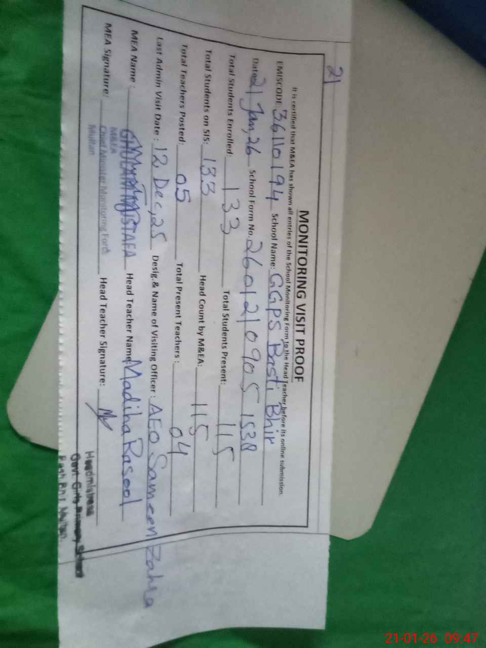 | EMIS Code: 36110194 | Name of School: GGPS BASTI BHIR MULTAN CENTER BOHDALA TOWN MULTAN | |||