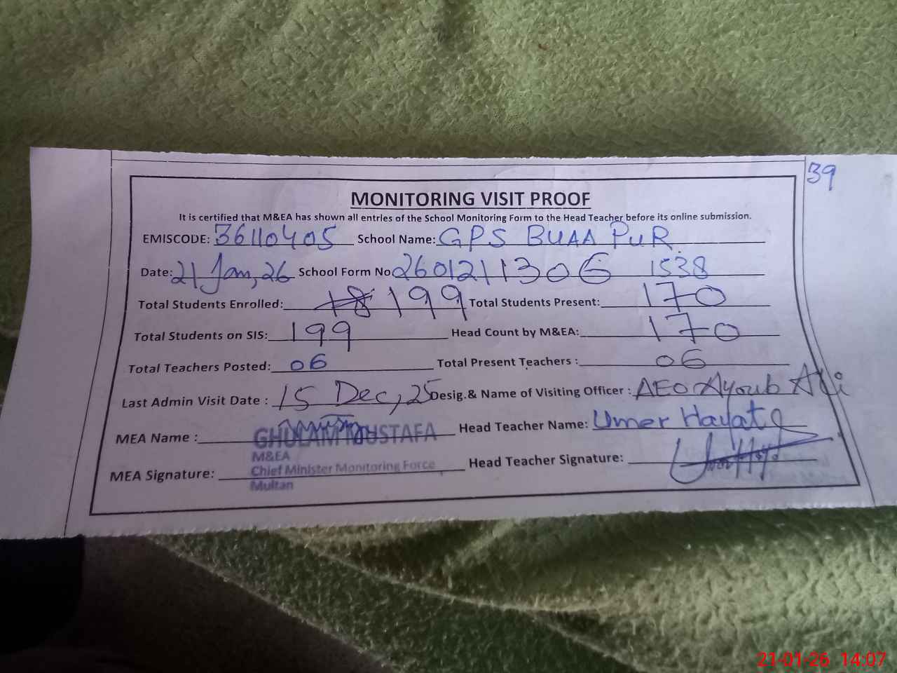 | EMIS Code: 36110405 | Name of School: GPS BUAA PUR KHANEWAL ROAD | |||