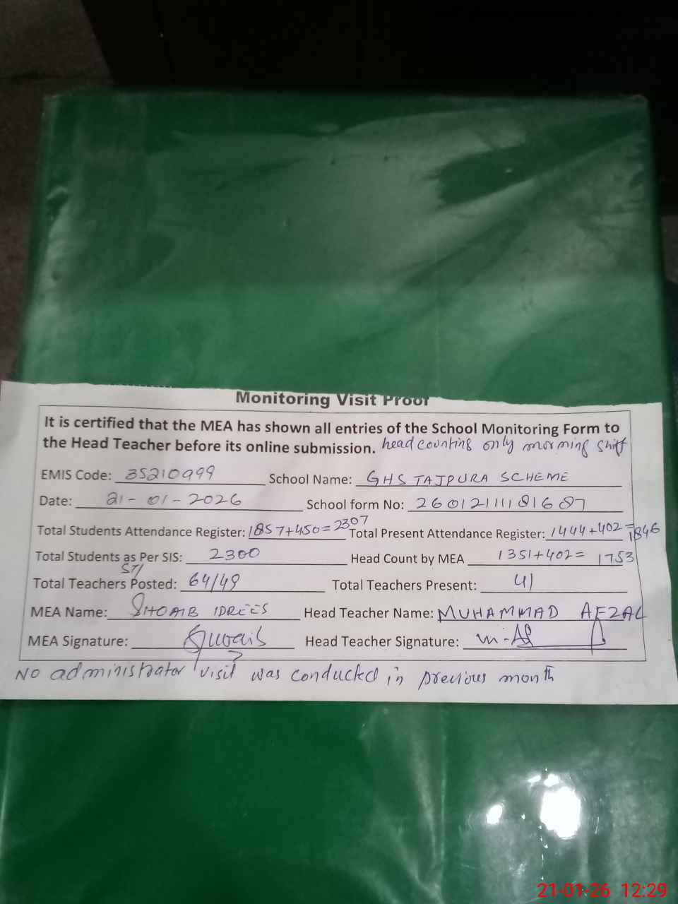 | EMIS Code: 35210999 | Name of School: GHS TAJPURA SCHEME SHALIMAR | |||