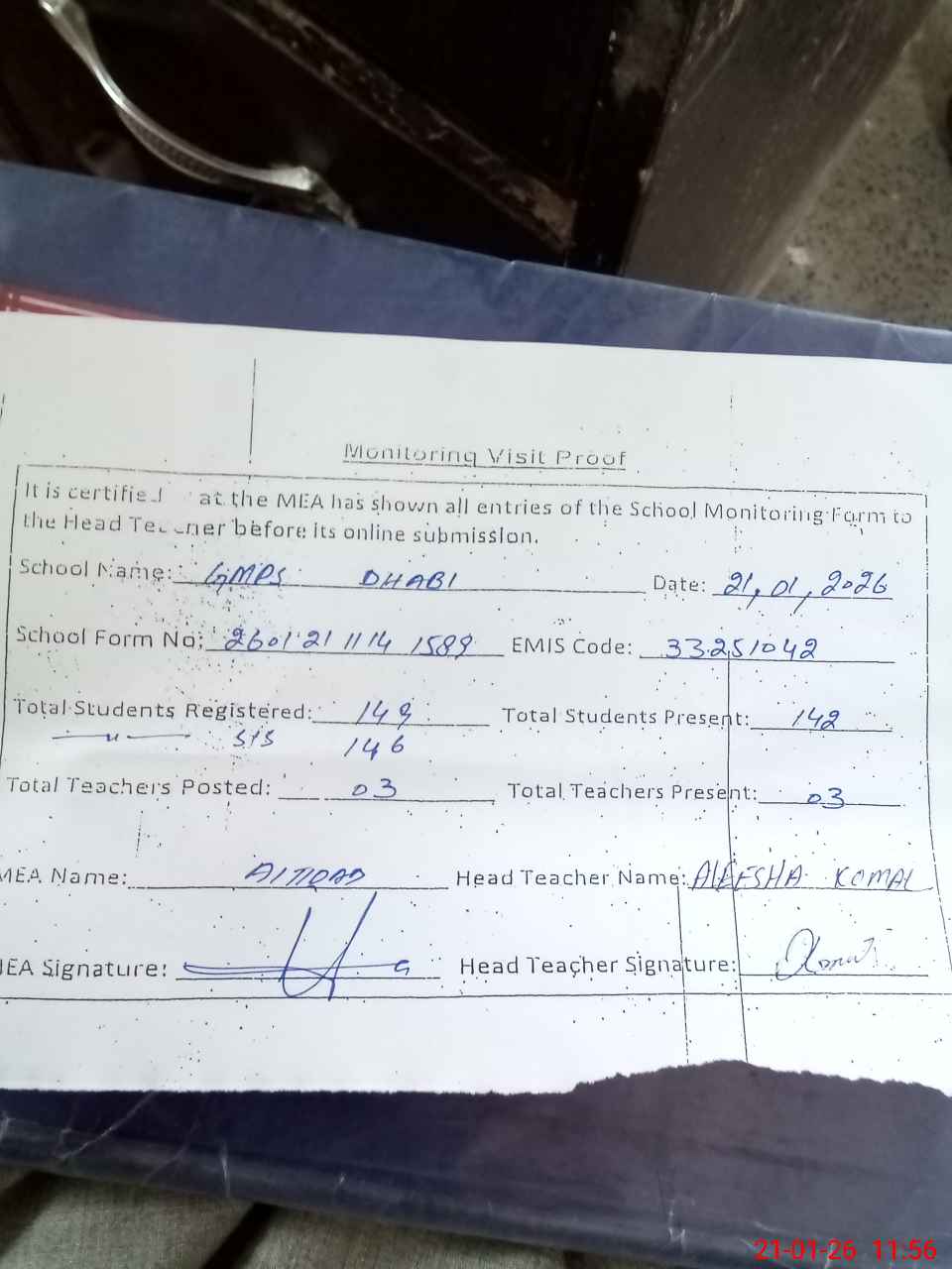 | Attendance Register | Head Teacher | MEA with School | Visit Proof |