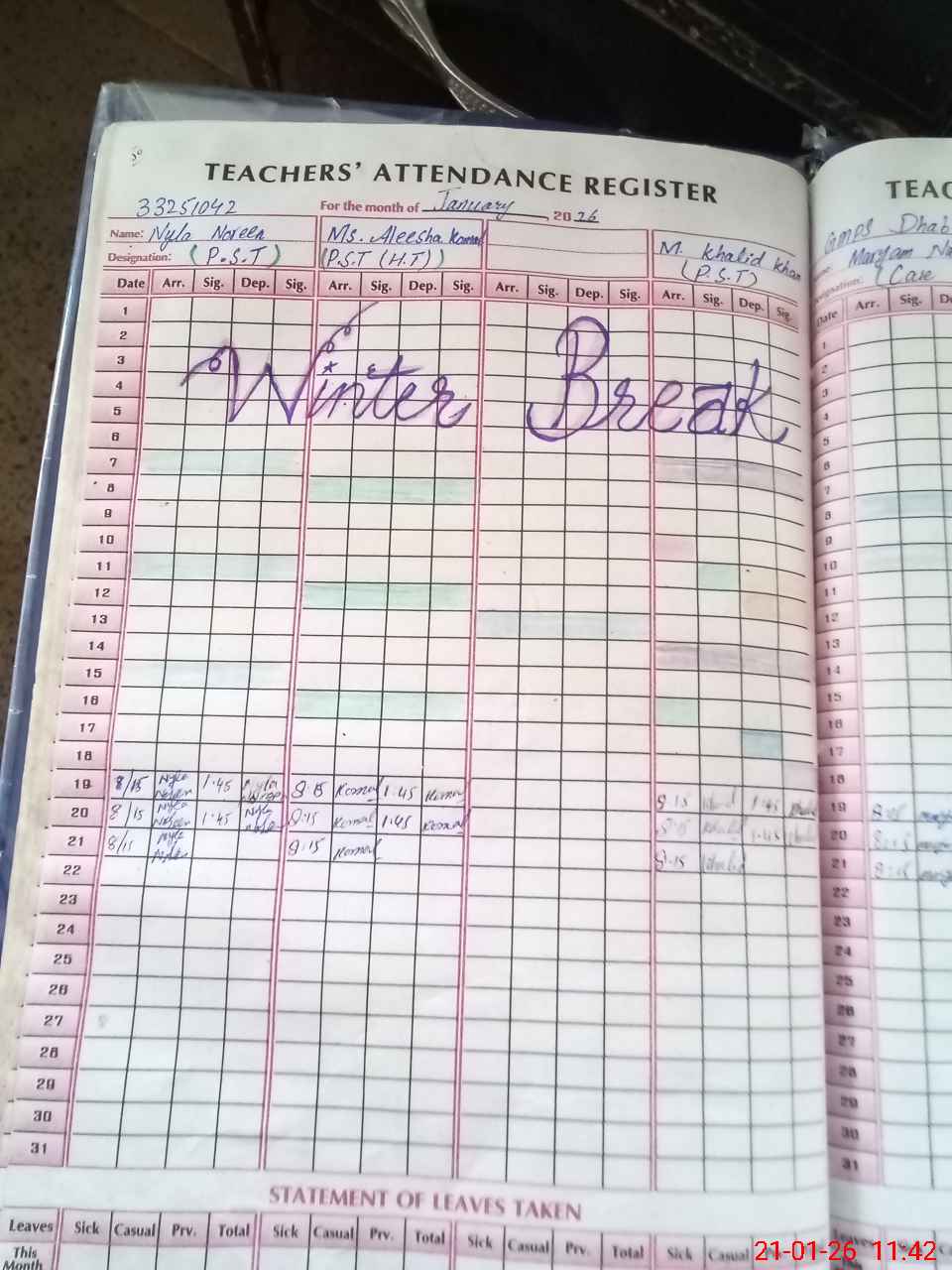 | Leave | Duty | Absent | Maternity | Medical | Ex- Pak |