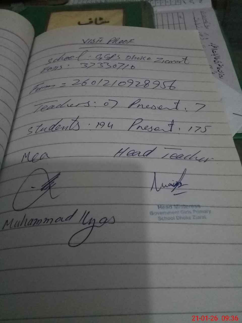 | Attendance Register | Head Teacher | MEA with School | Visit Proof |