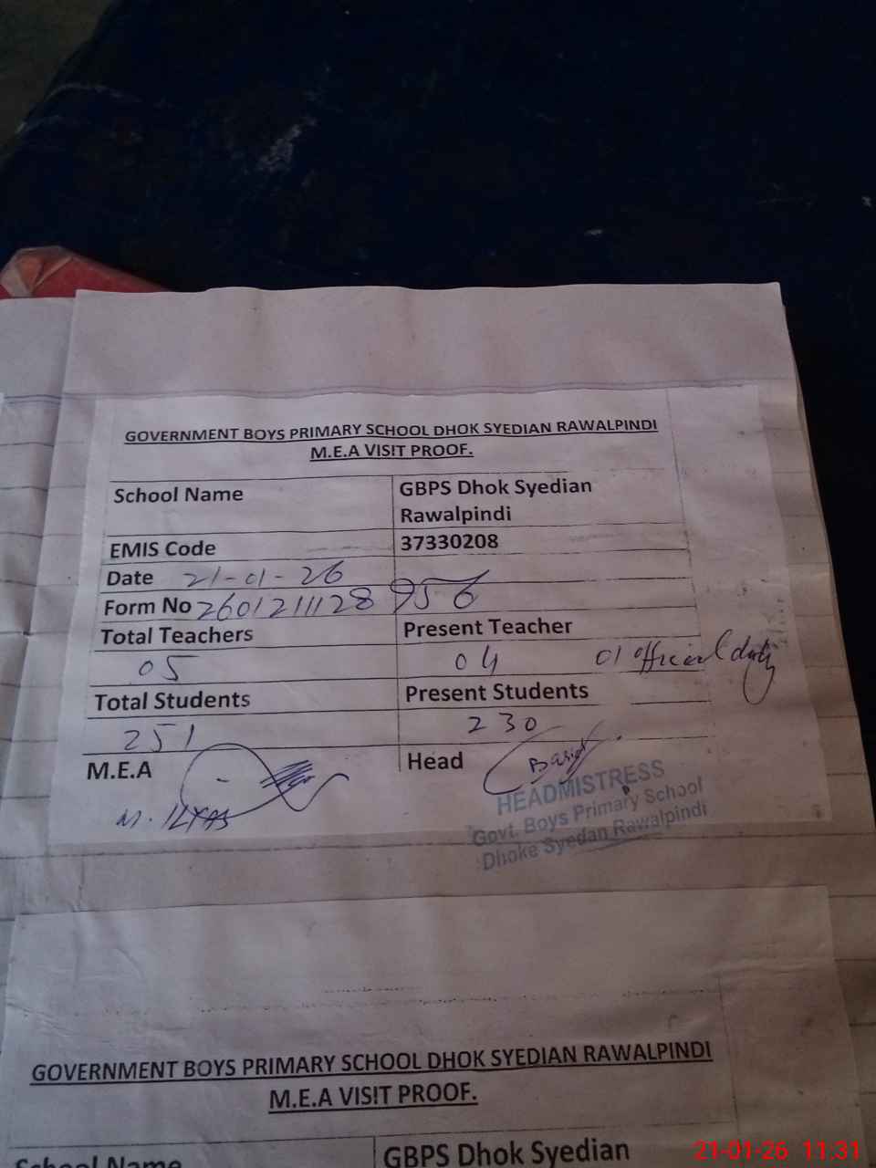 | Attendance Register | Head Teacher | MEA with School | Visit Proof |