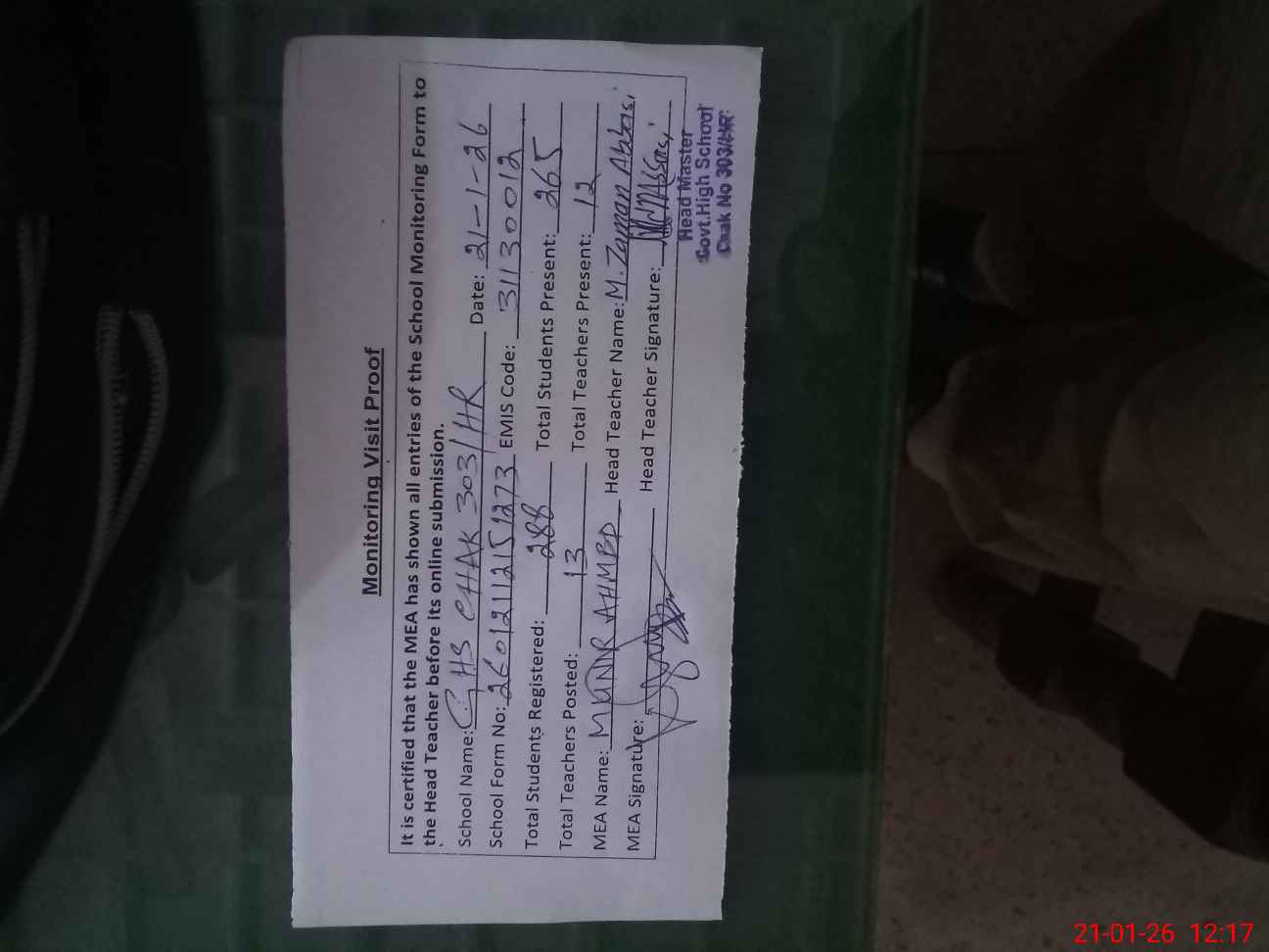 | Attendance Register | Head Teacher | MEA with School | Visit Proof |