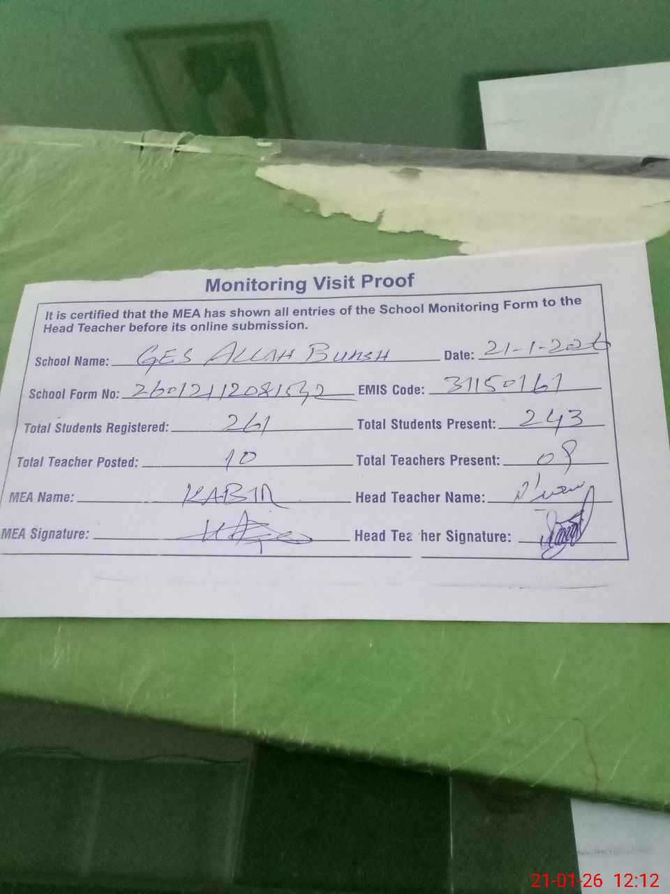 | Attendance Register | Head Teacher | MEA with School | Visit Proof |