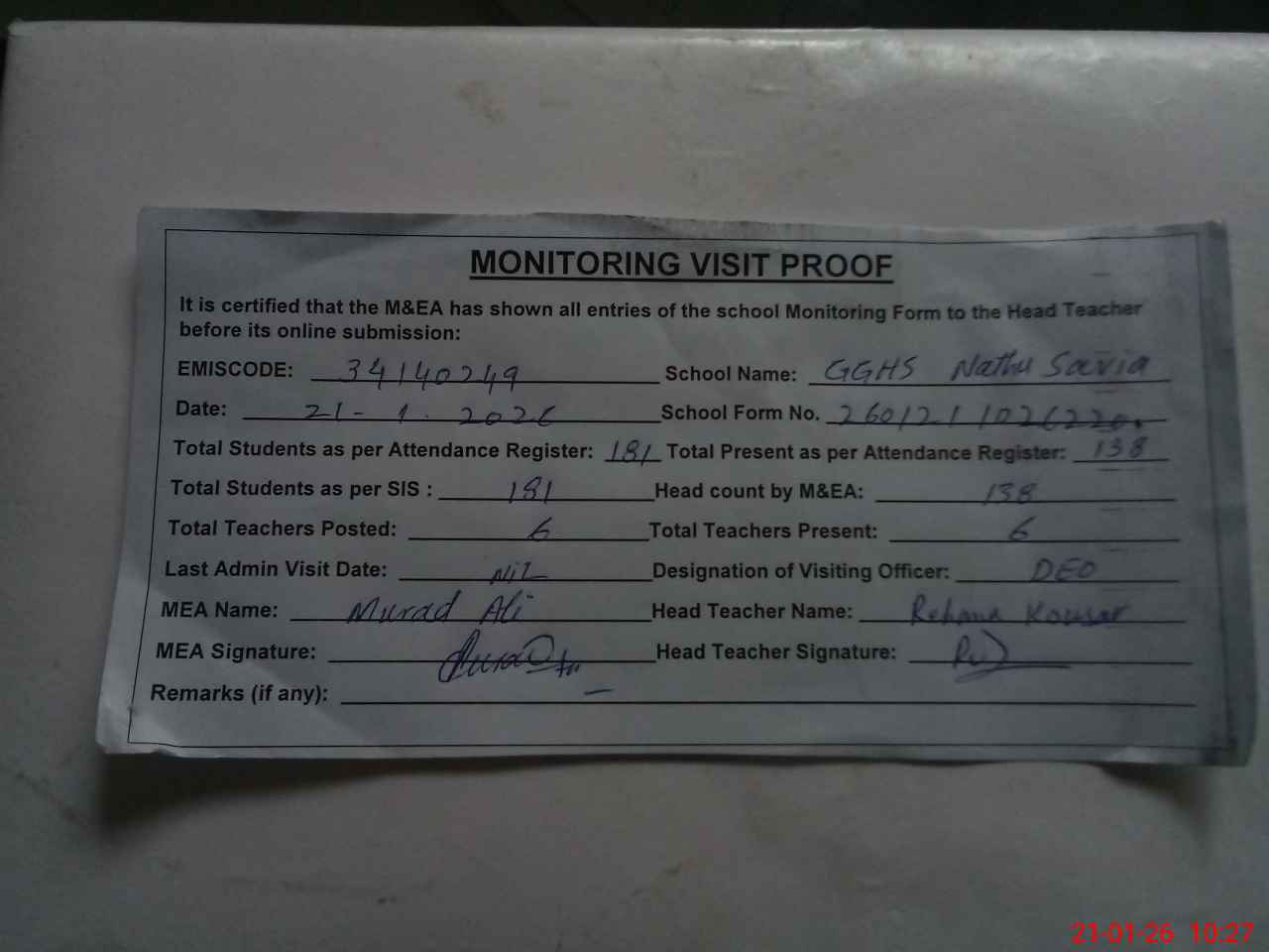 | Attendance Register | Head Teacher | MEA with School | Visit Proof |