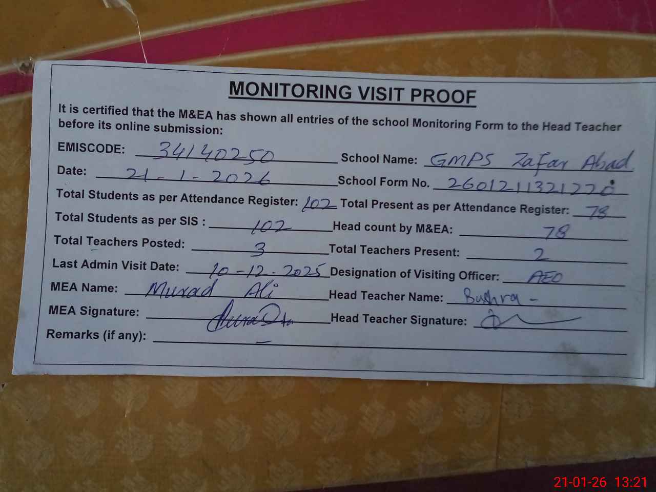 | Attendance Register | Head Teacher | MEA with School | Visit Proof |