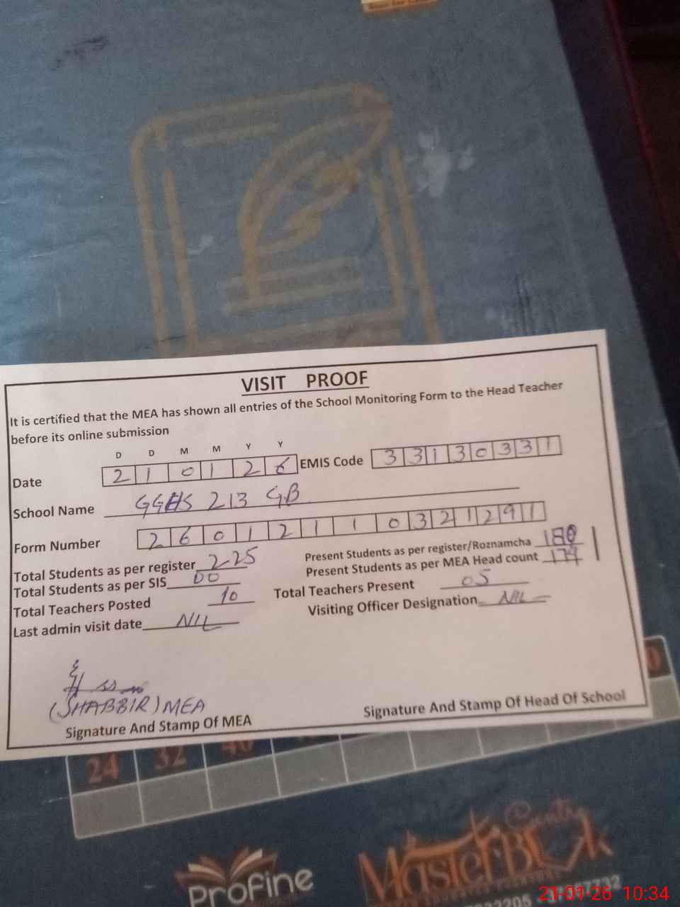 | Attendance Register | Head Teacher | MEA with School | Visit Proof |