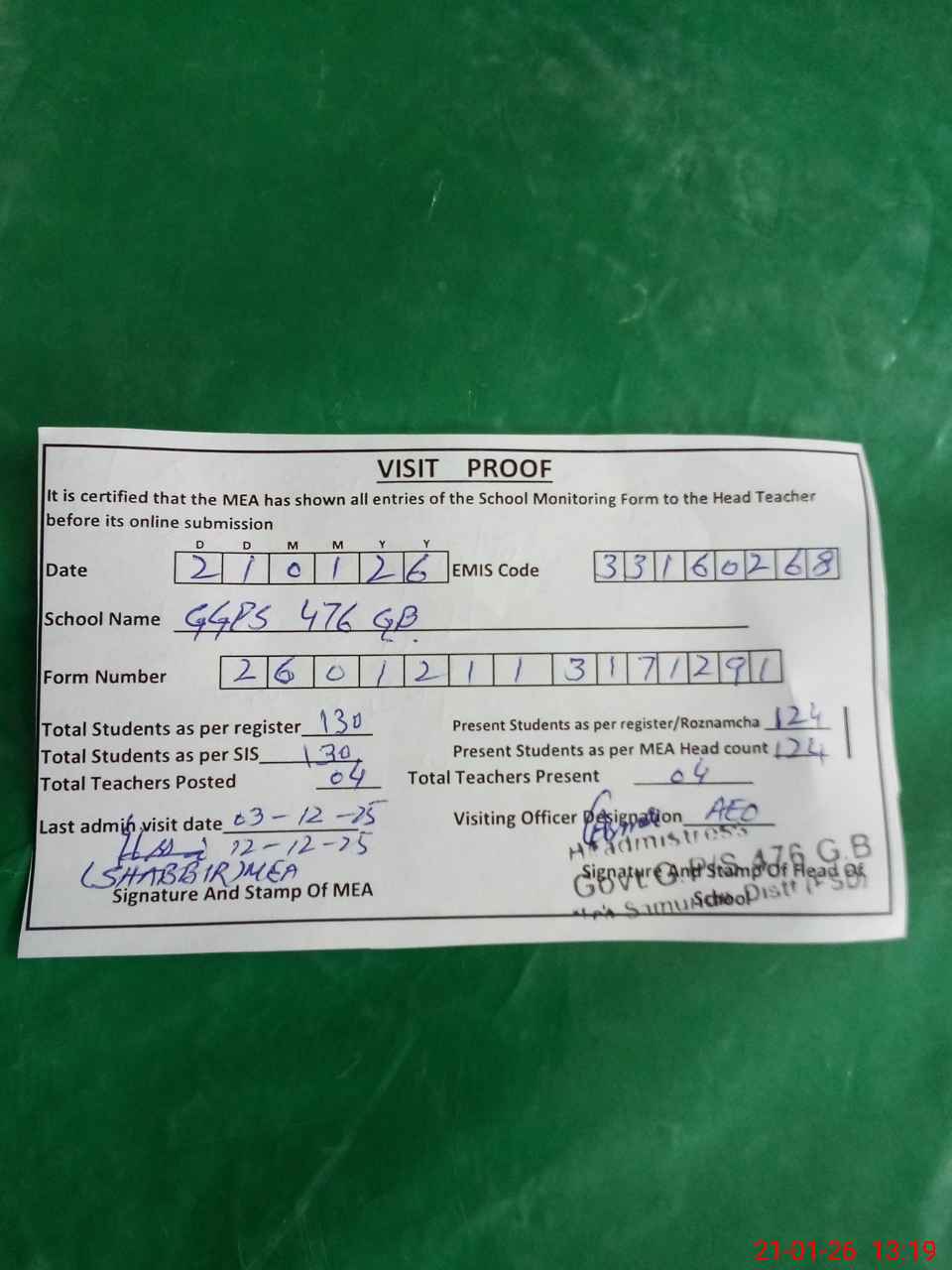 | EMIS Code: 33130268 | Name of School: GGPS CHAK NO 476 GB | |||