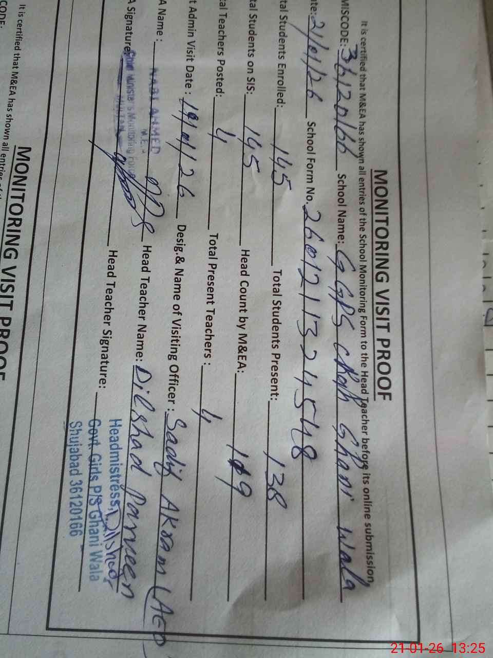 | Attendance Register | Head Teacher | MEA with School | Visit Proof |