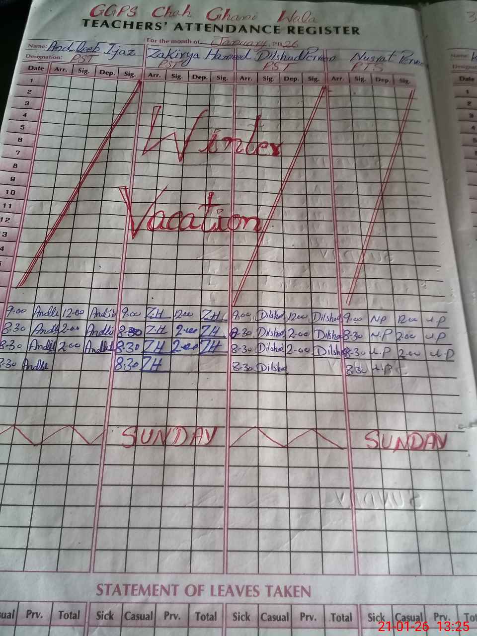| Leave | Duty | Absent | Maternity | Medical | Ex- Pak |