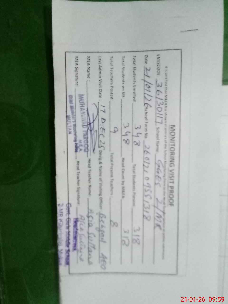 | Attendance Register | Head Teacher | MEA with School | Visit Proof |
