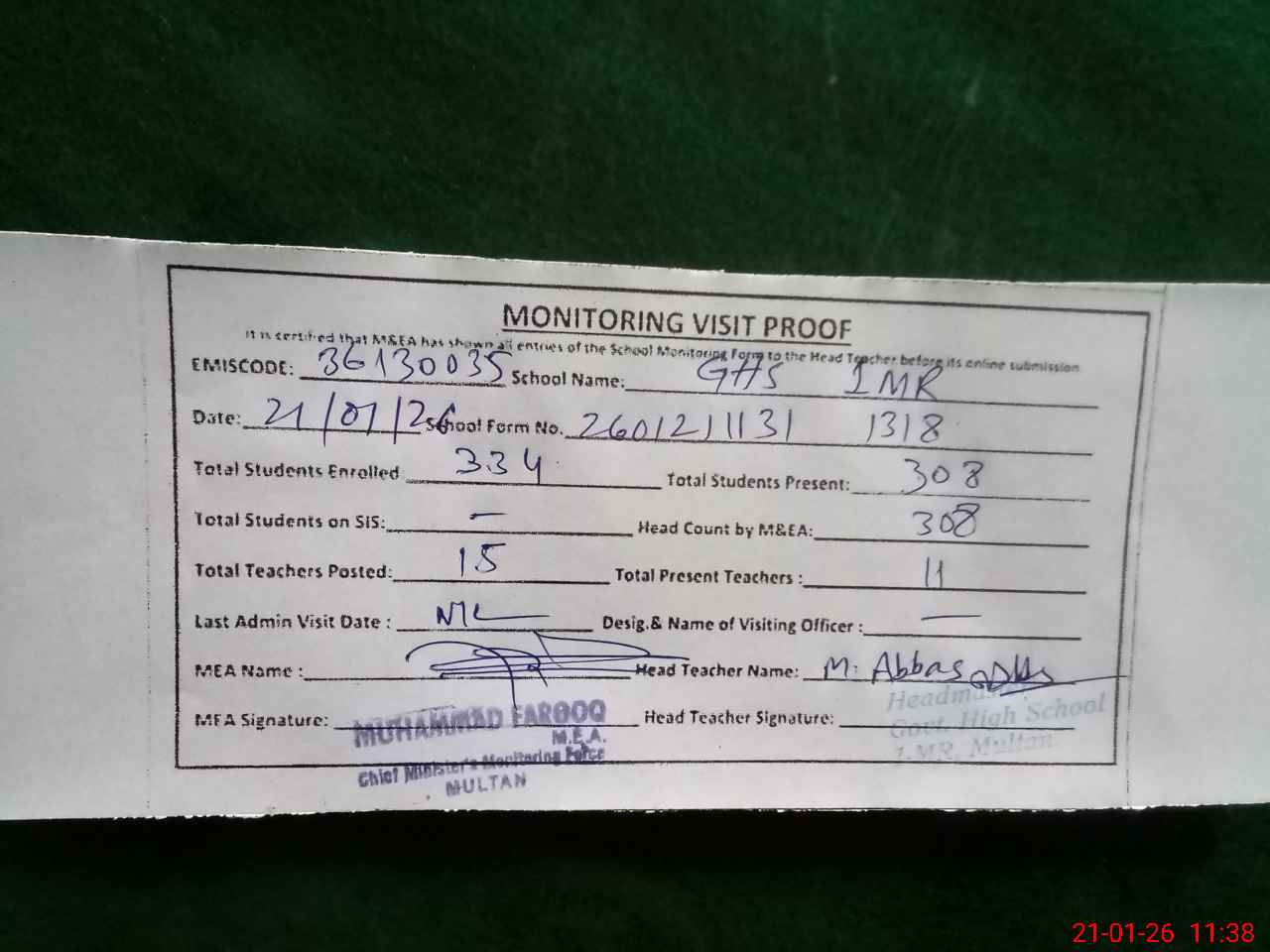 | EMIS Code: 36130035 | Name of School: GHS CHAK NO. 1/MR P/O KHAS MULTAN | |||