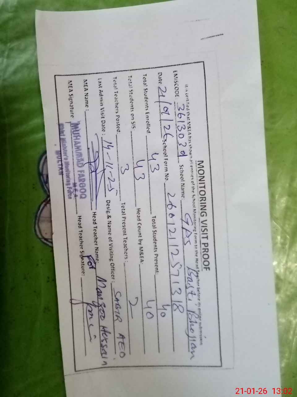 | Attendance Register | Head Teacher | MEA with School | Visit Proof |