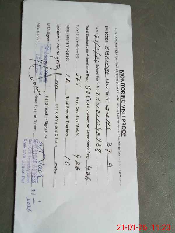| EMIS Code: 31320036 | Name of School: GGHS CHAK NO. 37/A | |||