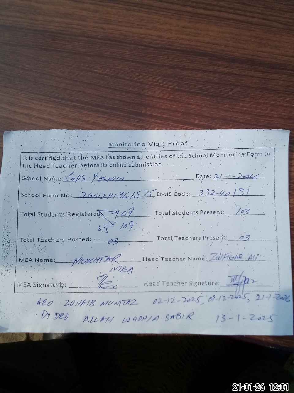 | EMIS Code: 33240131 | Name of School: GPS YASMIN | |||