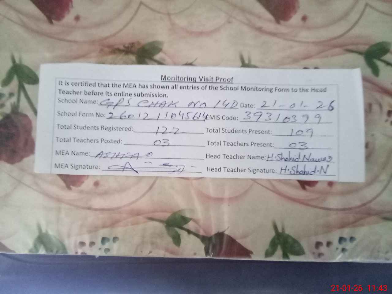 | Attendance Register | Head Teacher | MEA with School | Visit Proof |