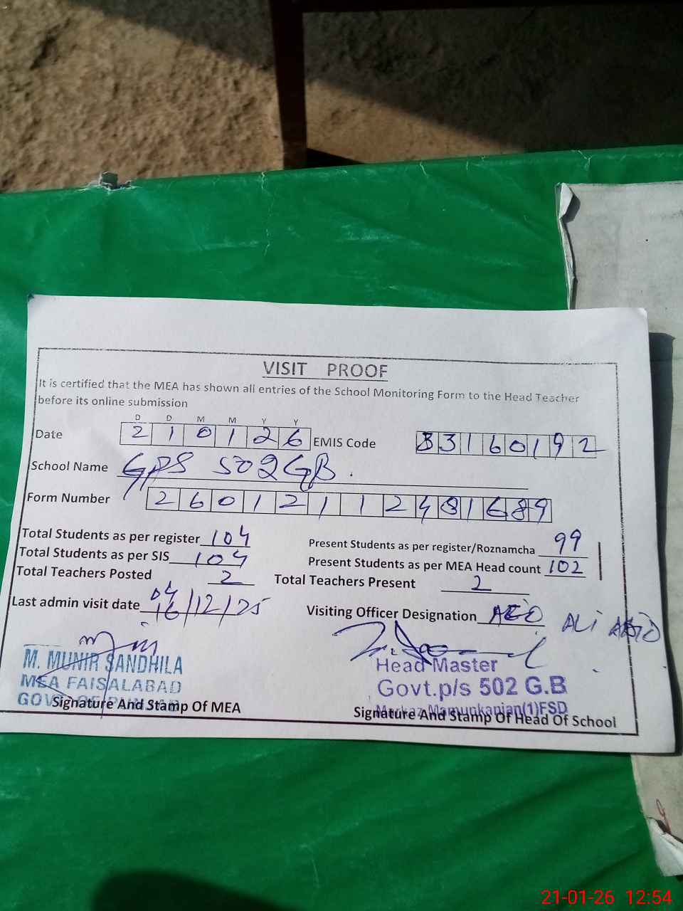 | EMIS Code: 33160192 | Name of School: GPS CHAK 502 GB MAMUNKANJAN | |||