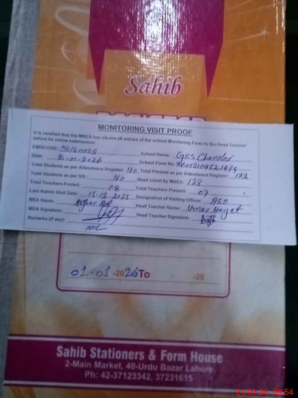 | Attendance Register | Head Teacher | MEA with School | Visit Proof |