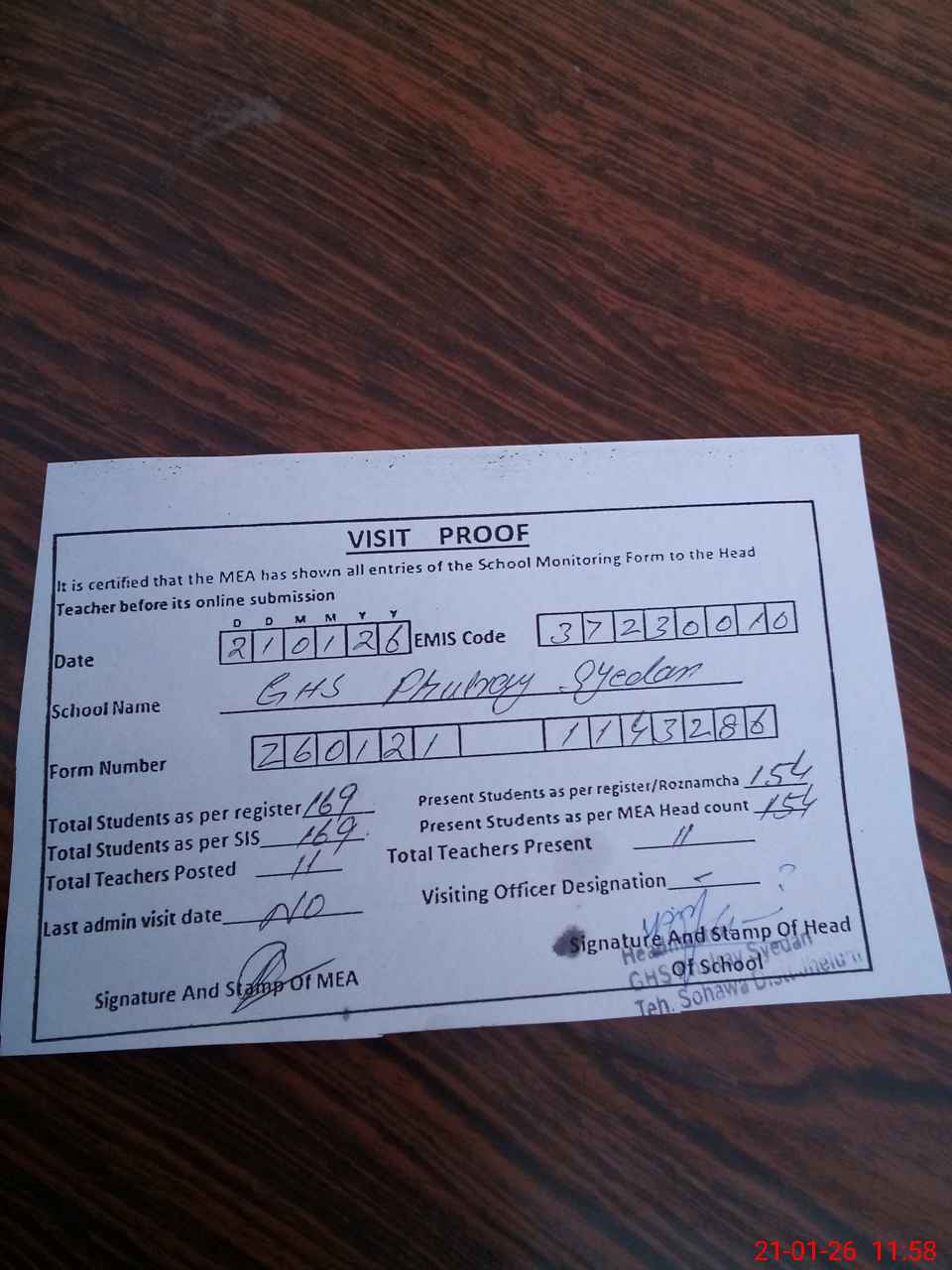| Attendance Register | Head Teacher | MEA with School | Visit Proof |