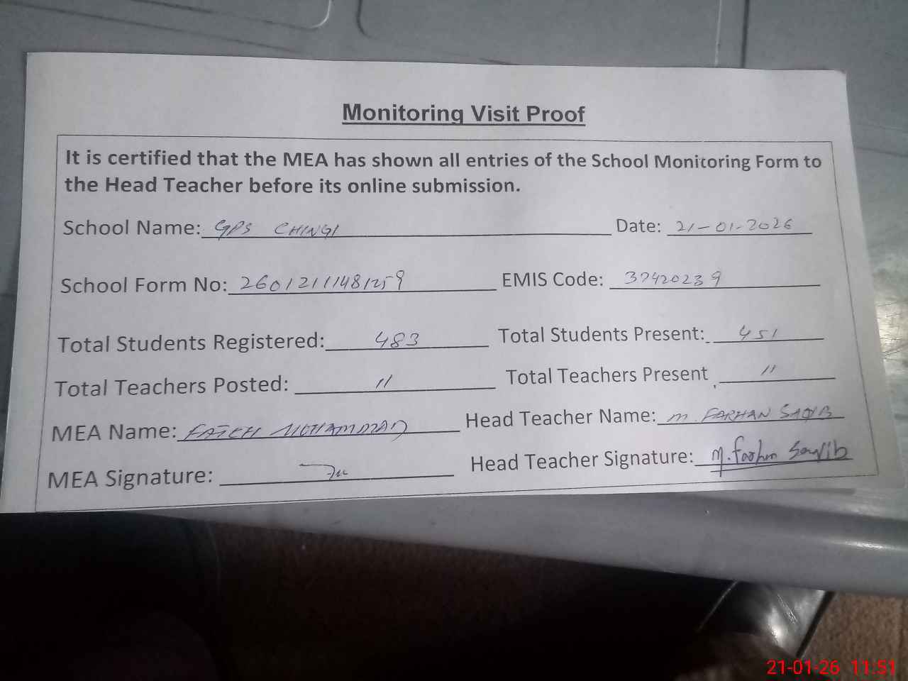 | Attendance Register | Head Teacher | MEA with School | Visit Proof |