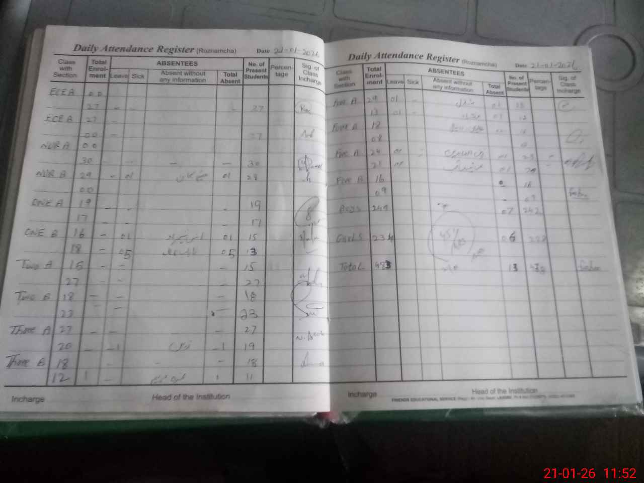 | No. of Students Present - Male | 0 | 27 | 34 | 33 | 35 | 41 | 38 | 238 | ||||||||