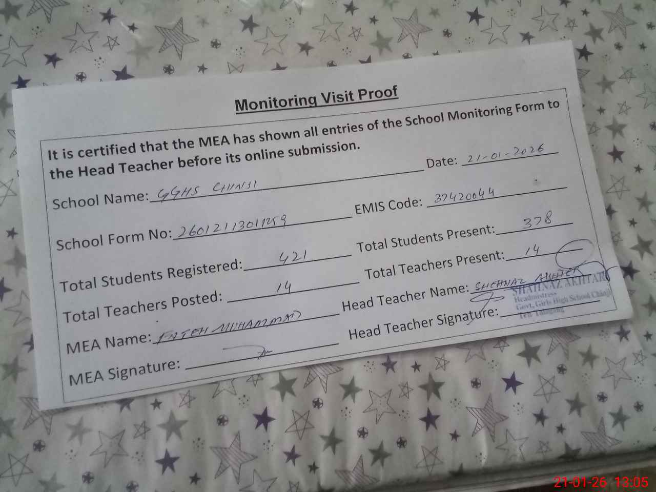 | Attendance Register | Head Teacher | MEA with School | Visit Proof |