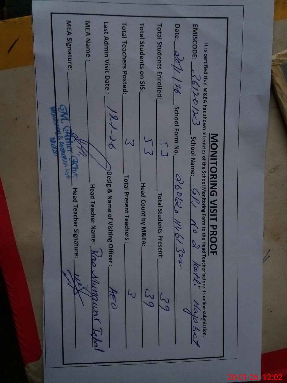 | Attendance Register | Head Teacher | MEA with School | Visit Proof |