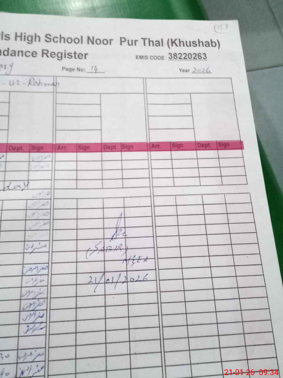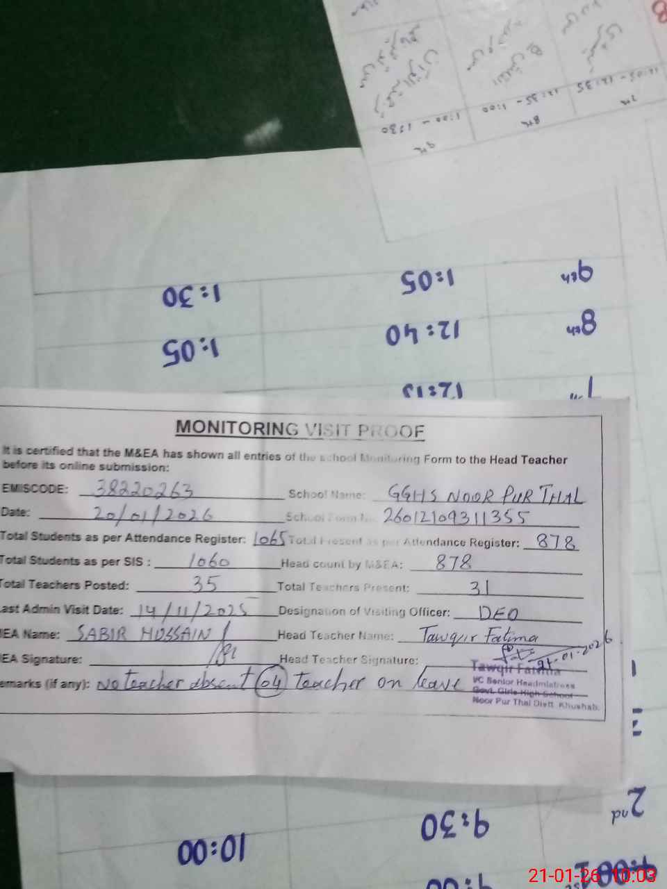 | Remarks (Use Separate Page if Required): no teacher absent total students on register 1065 total students on SiS 1060 Last admin visit by DEO SE on 14 Nov 2025 | |||||