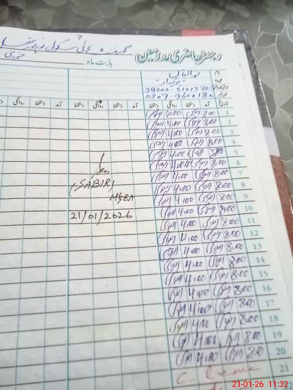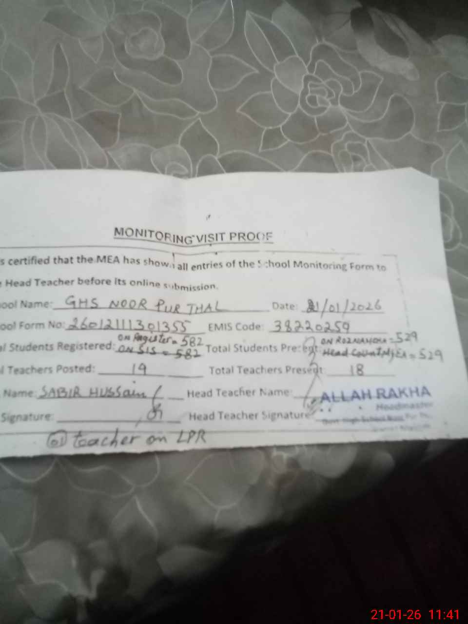 | Remarks (Use Separate Page if Required): no teacher absent total students on register 582 total students on SiS 582 last admin visit by AEO on 15 Dec 2025 | |||||