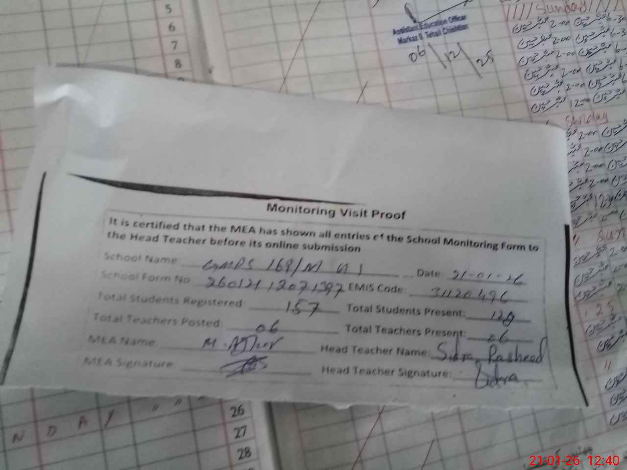 | Attendance Register | Head Teacher | MEA with School | Visit Proof |