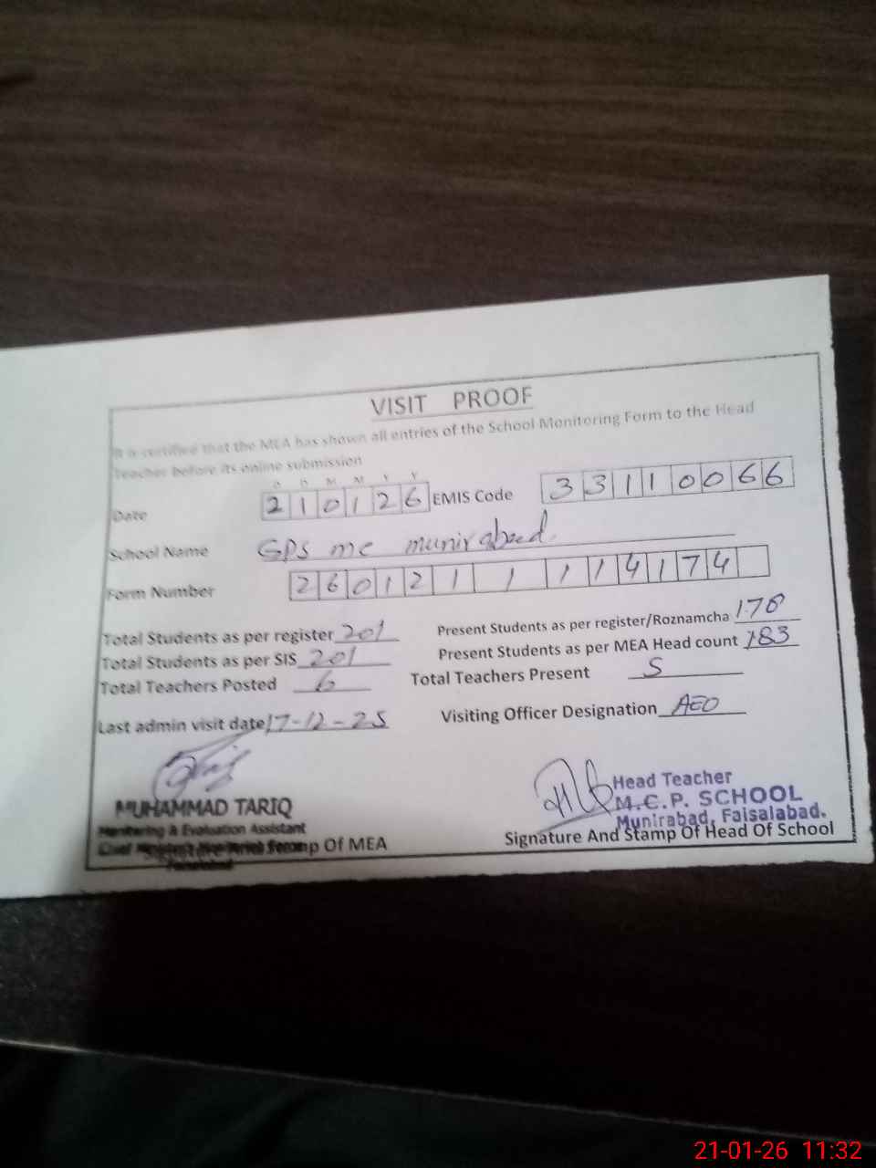 | Attendance Register | Head Teacher | MEA with School | Visit Proof |