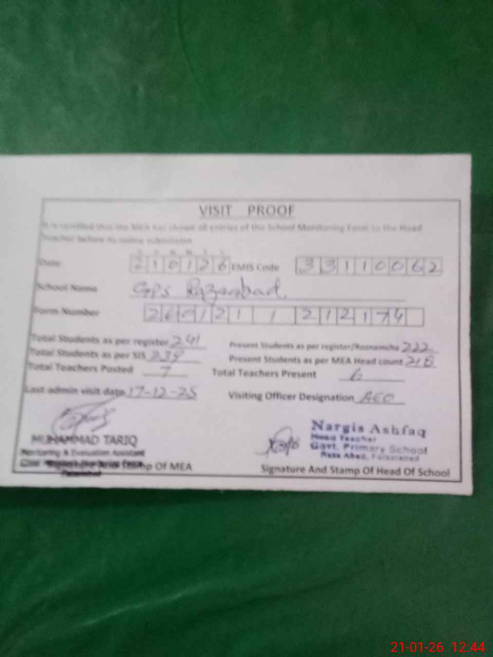 | EMIS Code: 33110062 | Name of School: GPS RAZA ABAD | |||