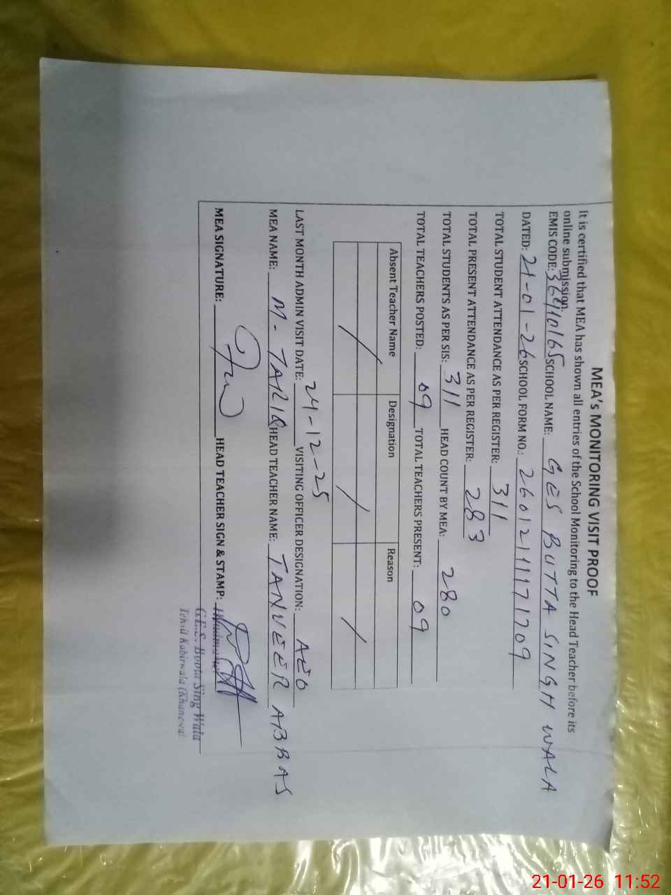 | EMIS Code: 36410165 | Name of School: GES BUTTA SINGH WALA, P/O MOUZA BUTTA SINGH WALA, KABIRWALA | |||