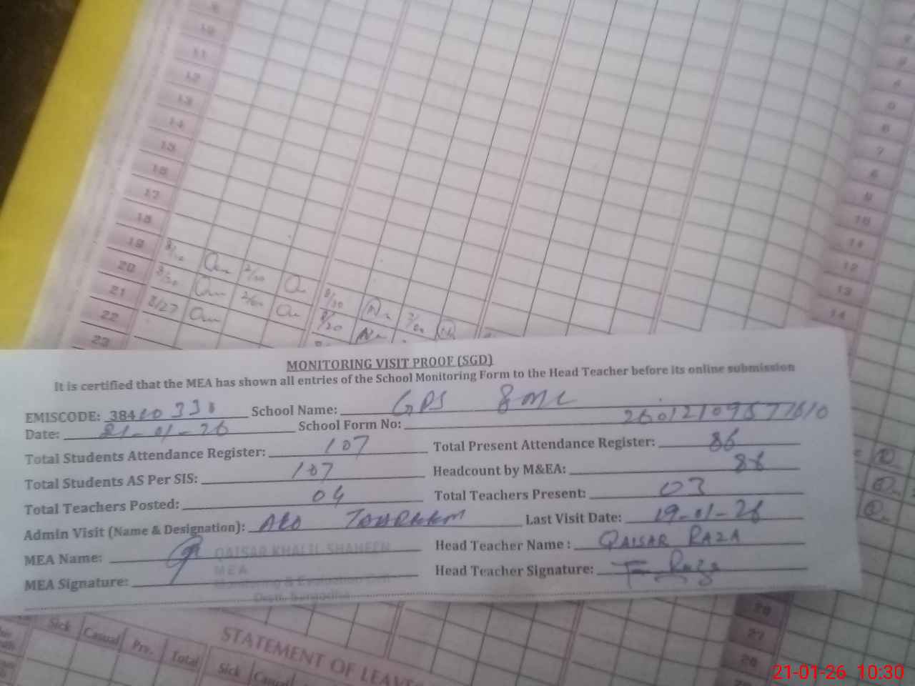| Attendance Register | Head Teacher | MEA with School | Visit Proof |