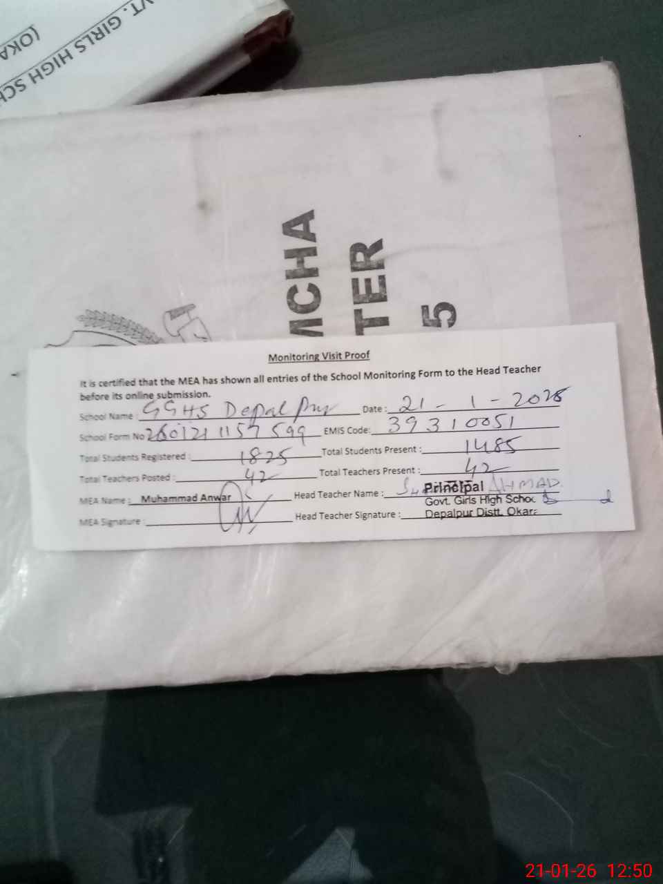 | Attendance Register | Head Teacher | MEA with School | Visit Proof |