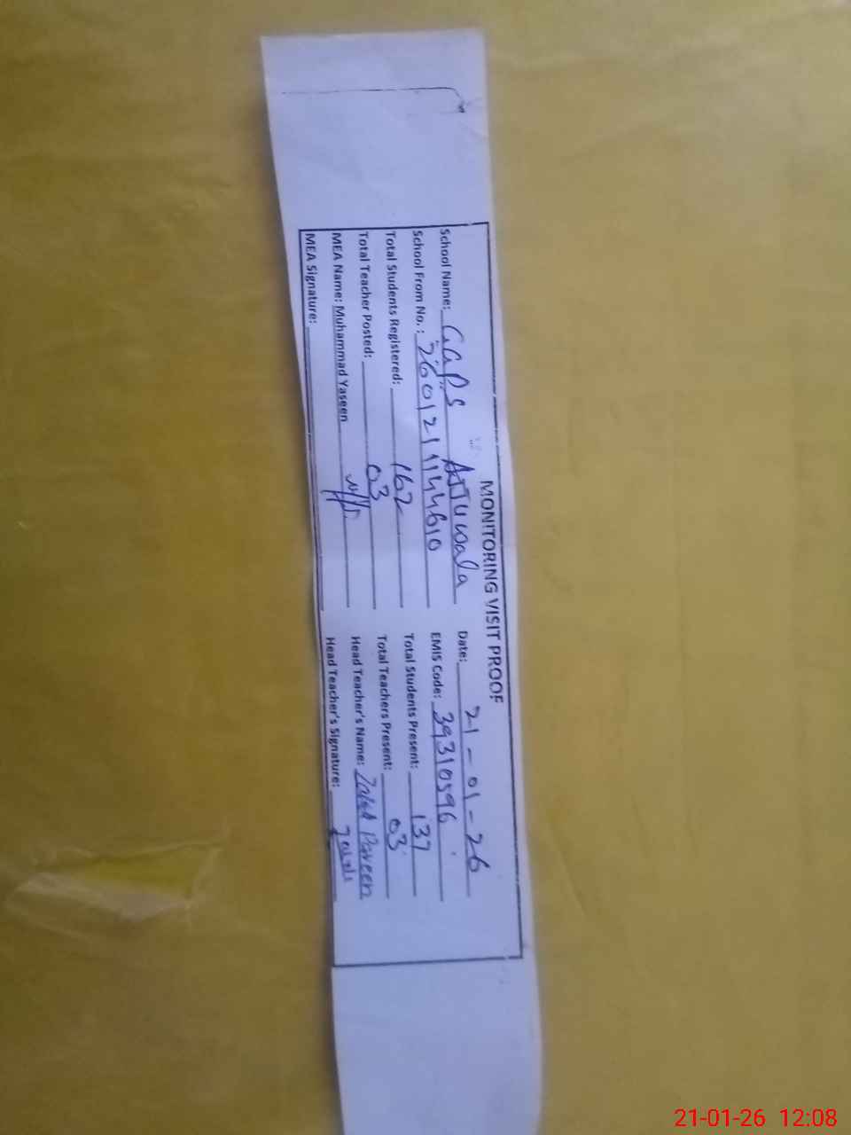 | Attendance Register | Head Teacher | MEA with School | Visit Proof |