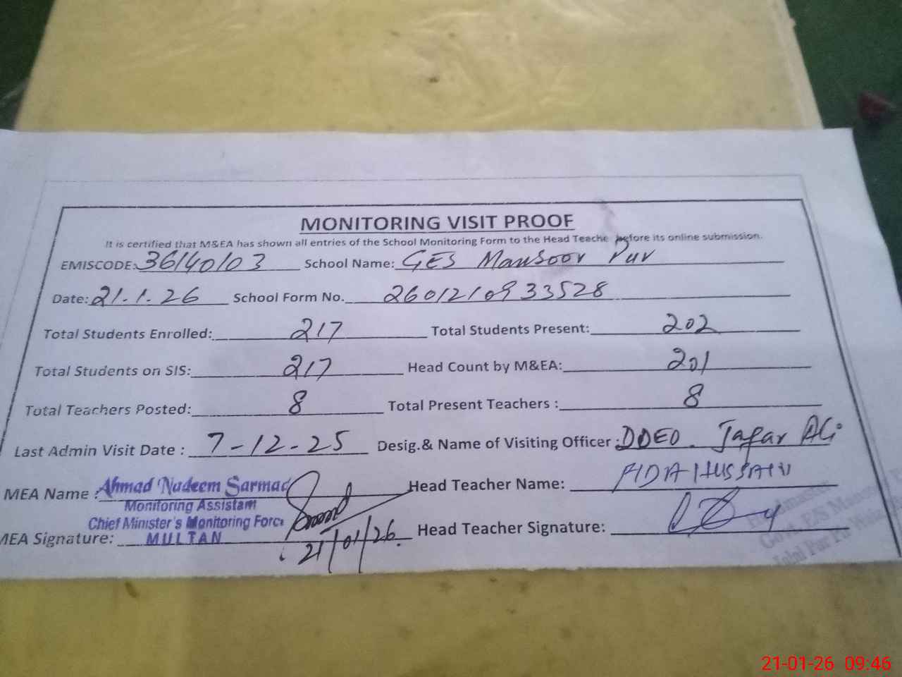 | EMIS Code: 36140103 | Name of School: GES MANSOOR PUR MOUZA MANSOOR PUR TAH. JALALPUR PIRWALA | |||