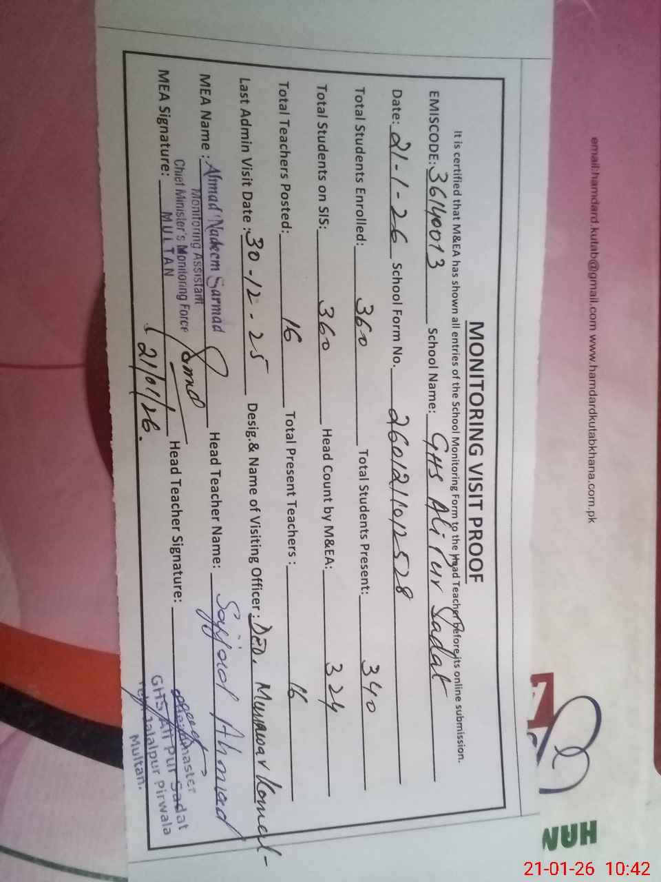 | EMIS Code: 36140013 | Name of School: GHS ALI PUR SADAT J.P. PIRWALA | |||