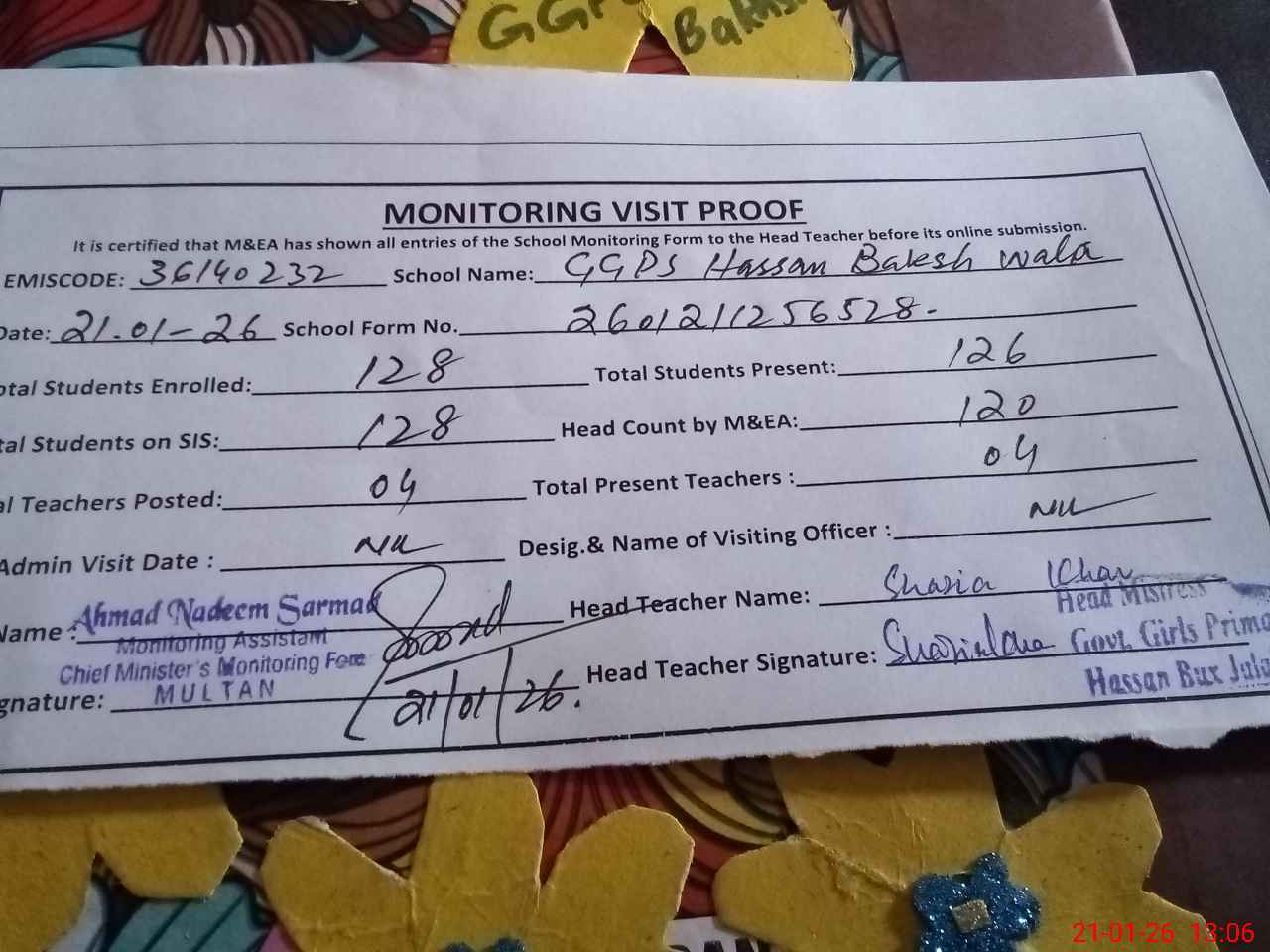 | Attendance Register | Head Teacher | MEA with School | Visit Proof |
