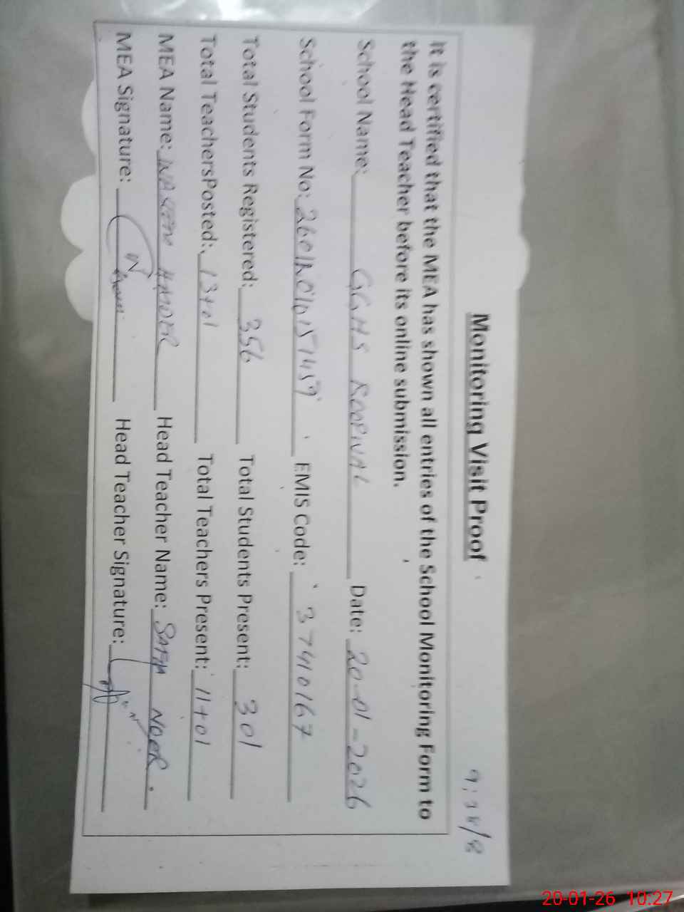 | Attendance Register | Head Teacher | MEA with School | Visit Proof |