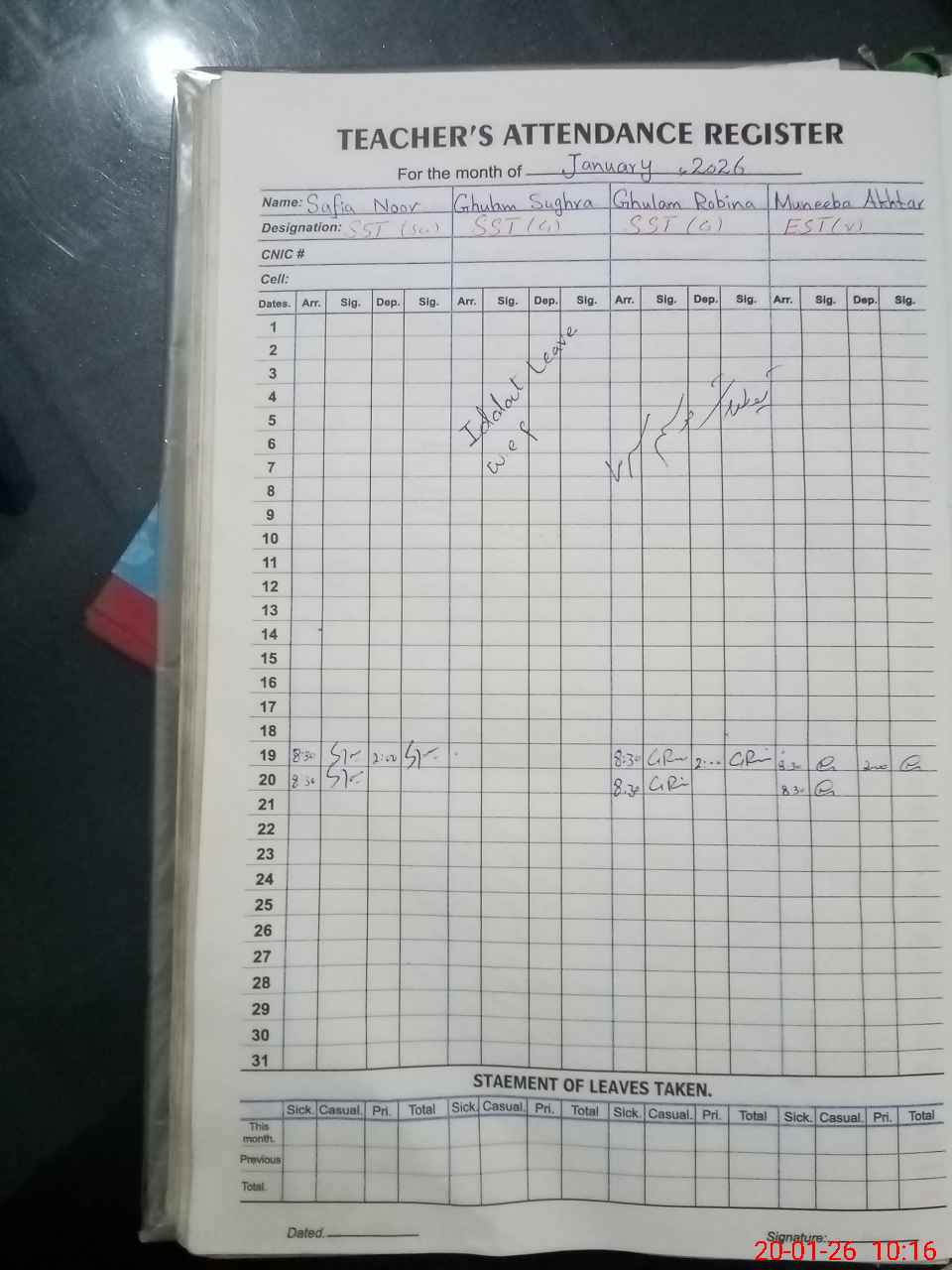| CNIC | Full Name | Designation | R/C | Absence During Last Calender Month |