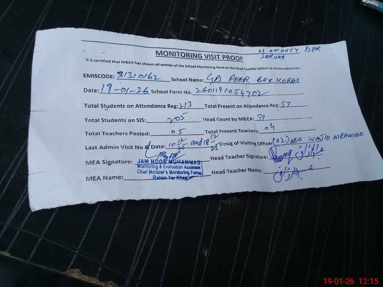 | EMIS Code: 31310162 | Name of School: GPS PEER BUX KORAI (After Noon) | |||