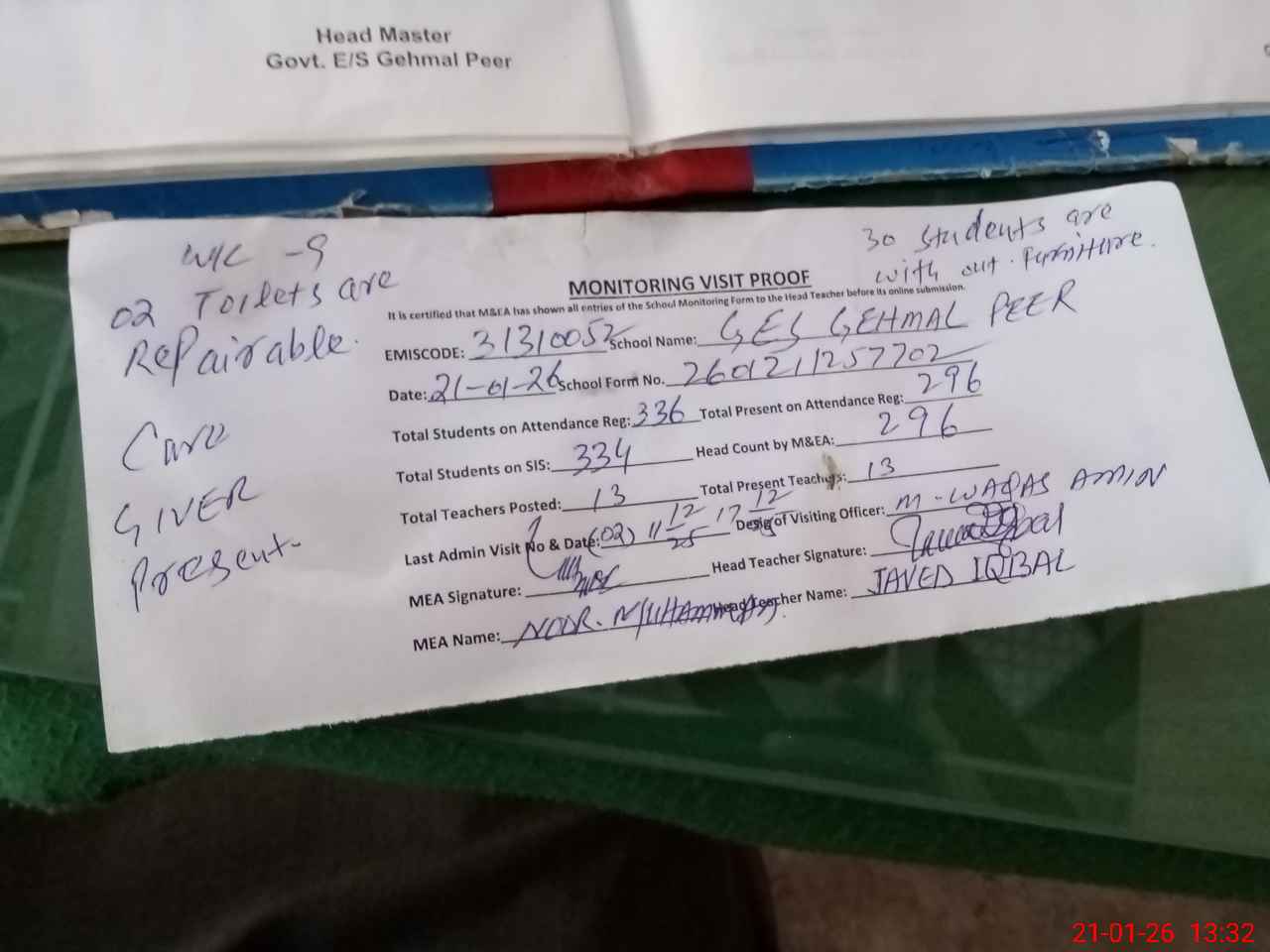 | Attendance Register | Head Teacher | MEA with School | Visit Proof |