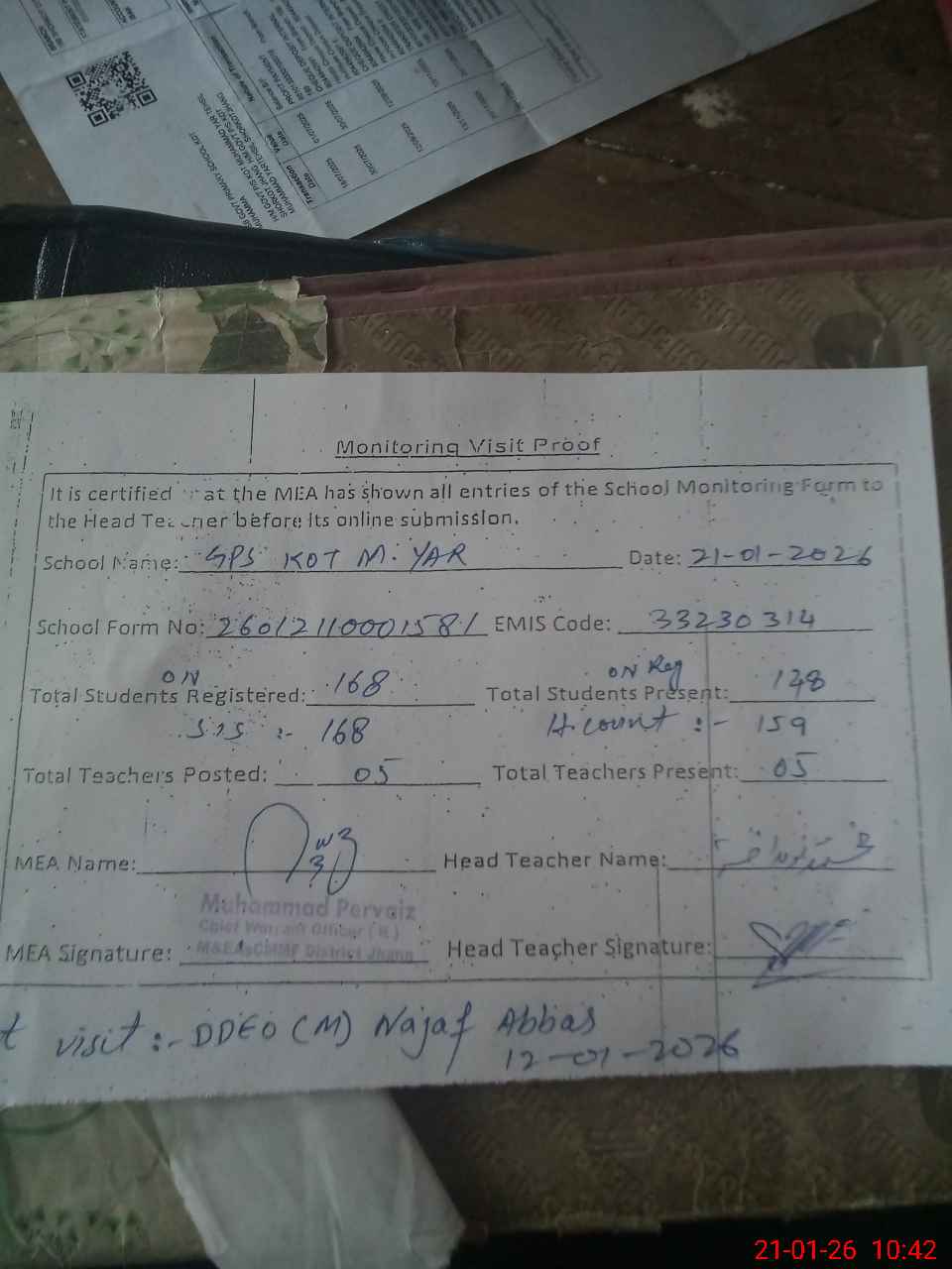 | Attendance Register | Head Teacher | MEA with School | Visit Proof |