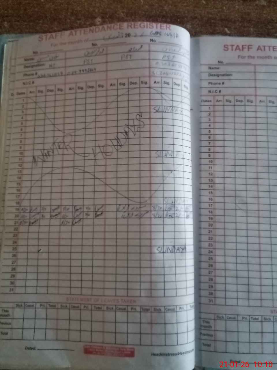 | CNIC | Full Name | Designation | R/C | Absence During Last Calender Month |